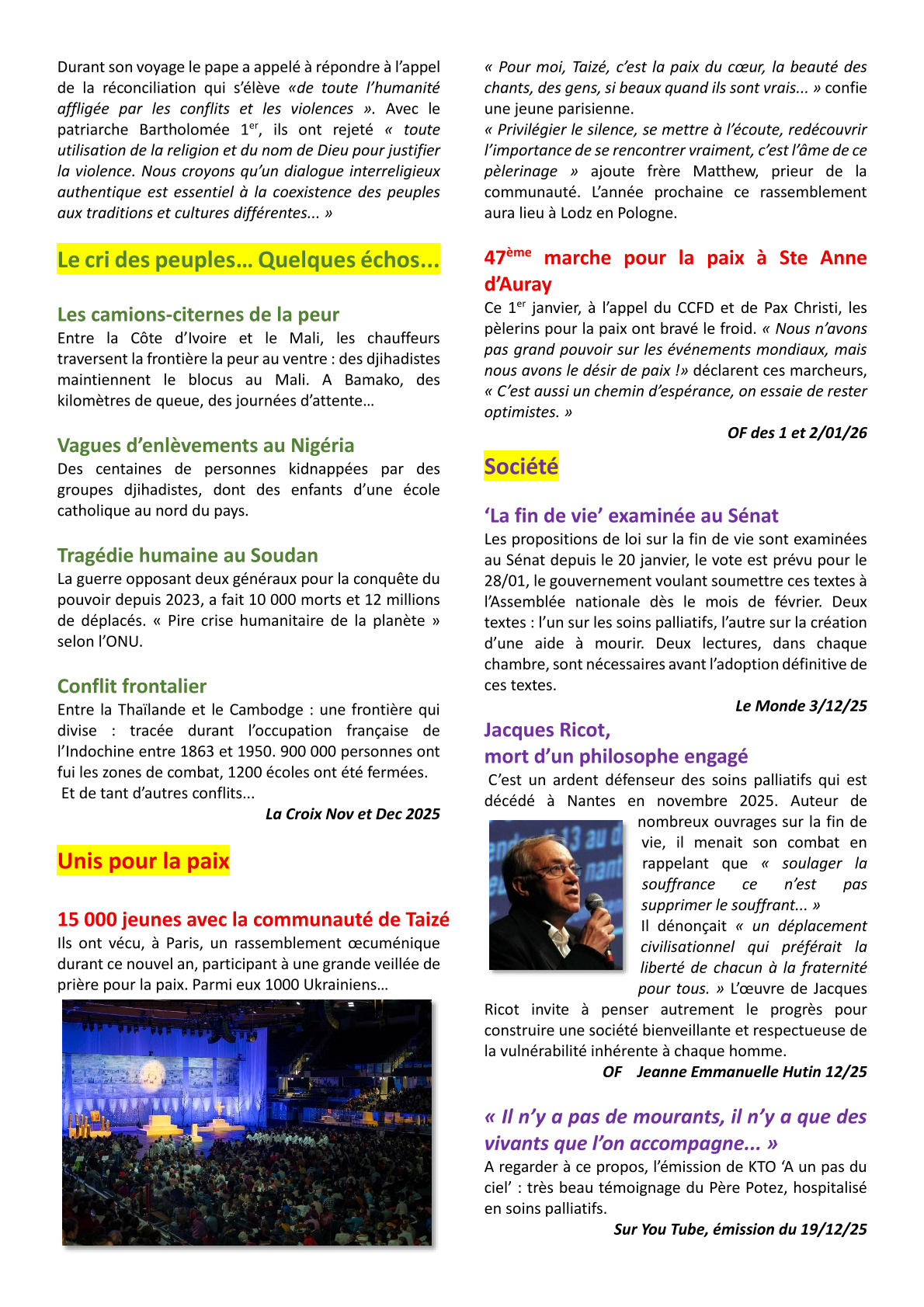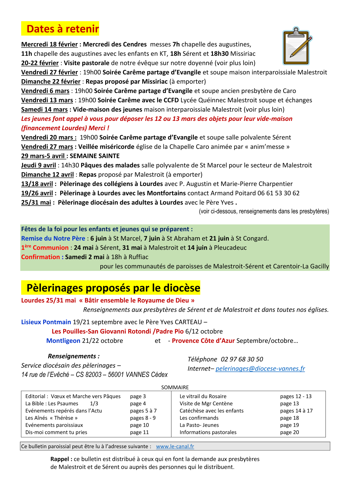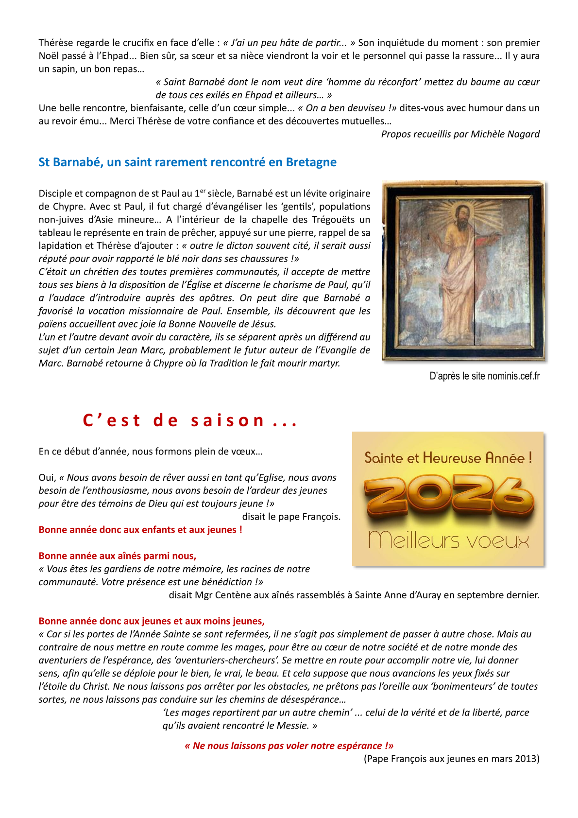 page 2, Agenda 2026 page 3, Editorial: En marche vers Pâques page 4, La Bible: Les Psaumes 1/3 page 5, Repéré dans l'Actu page 6, Repéré dans l'Actu page 7, Repéré dans l'Actu page 8, Les Aînés : Thérèse page 9, Saint Barnabé page 10, Evénements paroissiaux page 11, Dis-moi comment tu pries page 12, Le Vitrail du Rosaire page 13, Visite de notre évêque page 14, La Catéchèse page 15, Les messes en Avent page 16, Vivre le temps de l'Avent page 17, Les célébrations page 18, En route vers la Confirmation page 19, La foi, c'est contagieux page 20, Informations pastorales