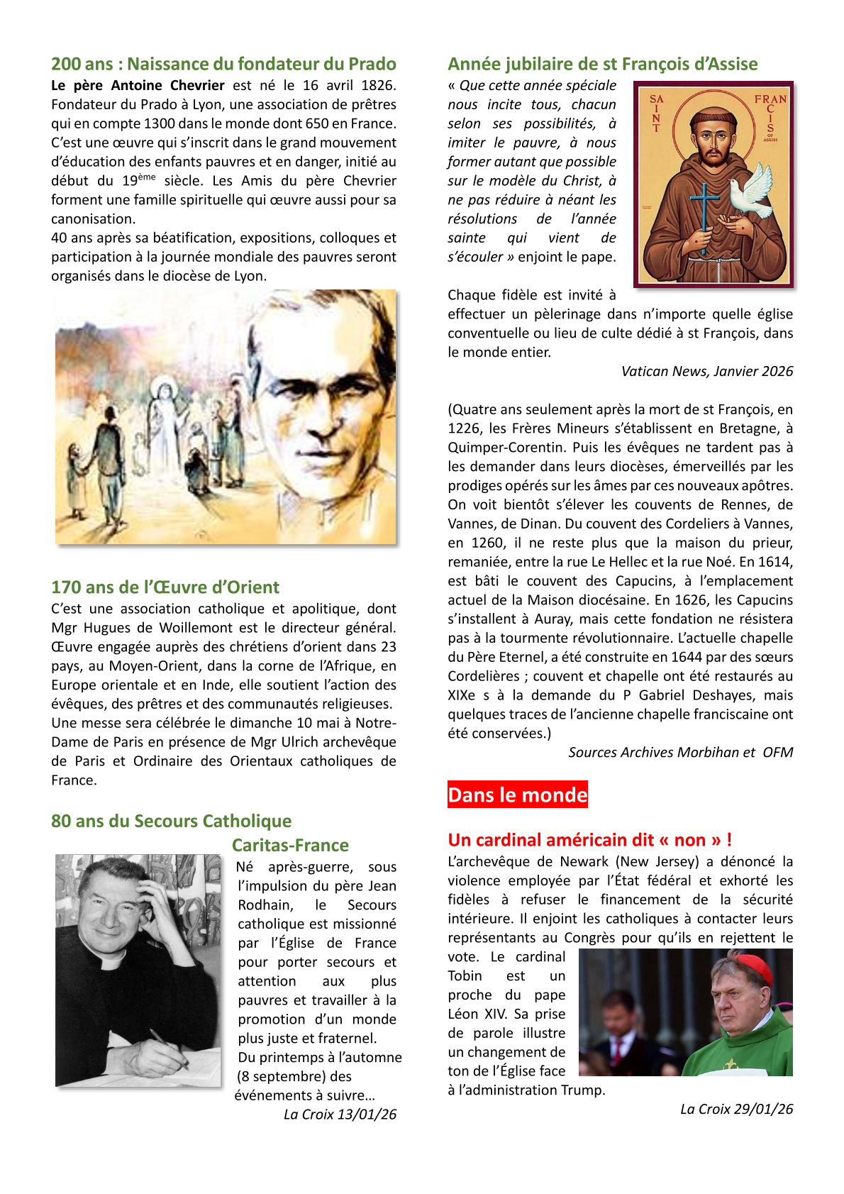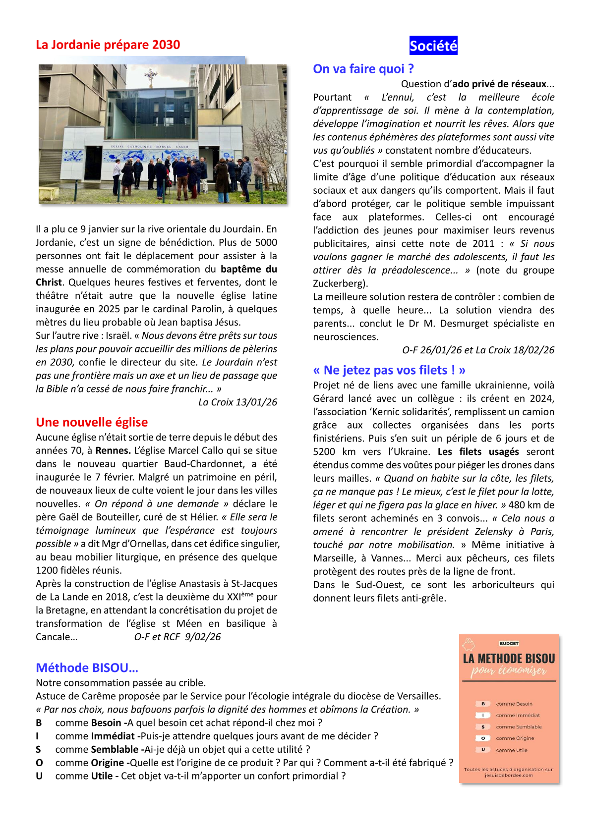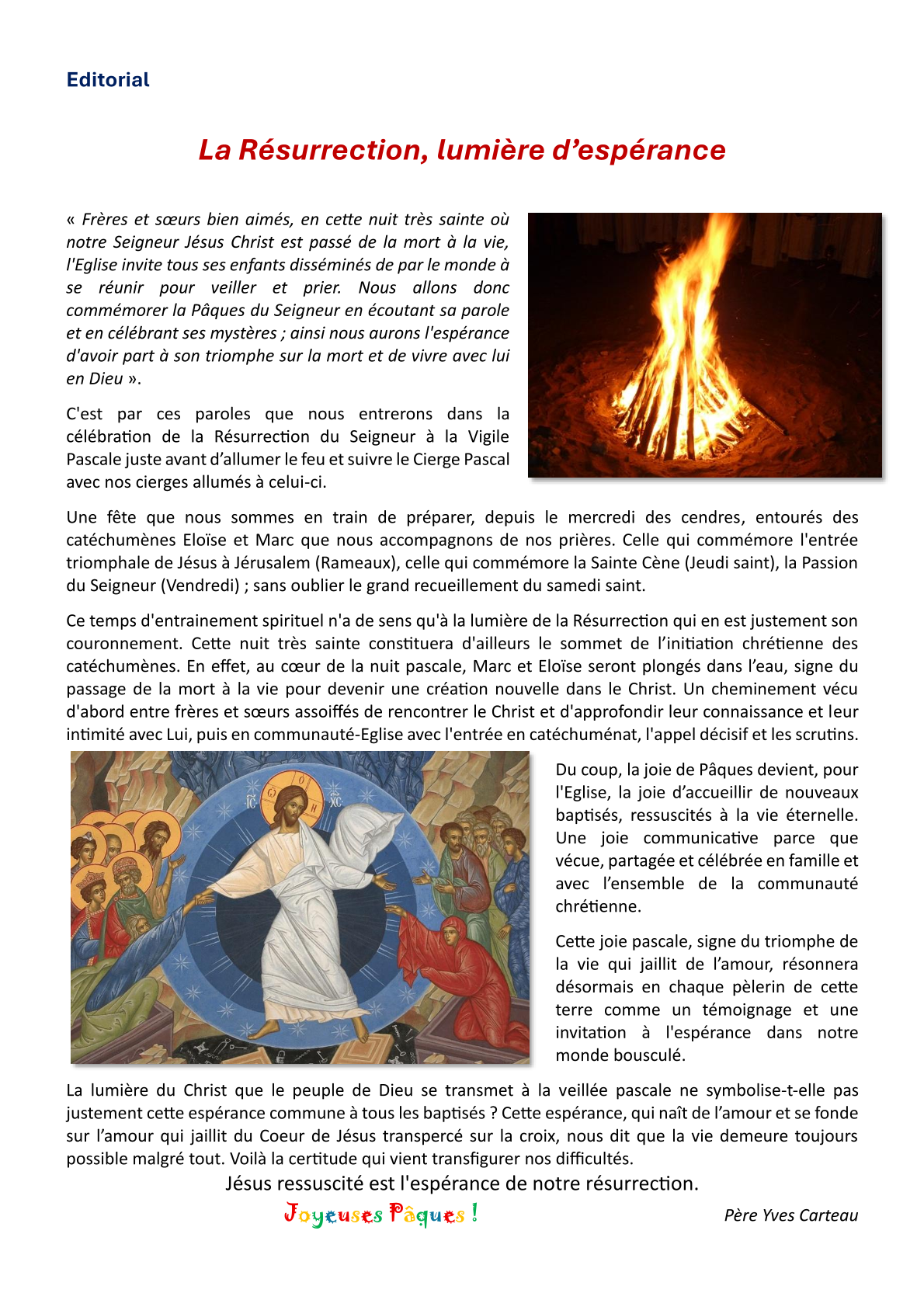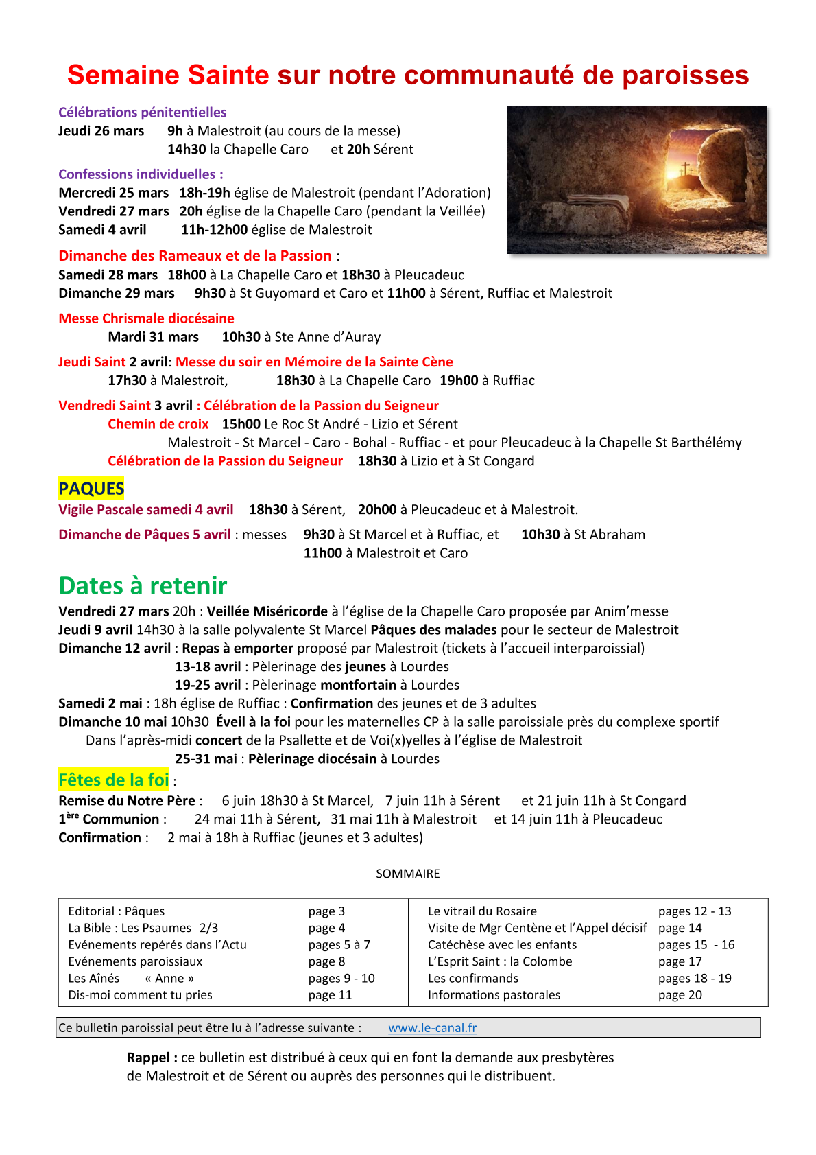 page 2, Agenda 2026 page 3, Editorial: La Résurrection page 4, La Bible: Les Psaumes 2/3 page 5, Repéré dans l'Actu page 6, Repéré dans l'Actu page 7, Repéré dans l'Actu page 8, Evénements paroissiaux page 9, Les Aînés : Anne page 10, Les Aînés : Anne page 11, Dis-moi comment tu pries page 12, Le Vitrail du Rosaire page 13, Le Vitrail du Rosaire page 14, Visite de Mgr Centène page 15, Catéchèse avec les enfants page 16, Catéchèse avec les enfants page 17, L'Esprit saint : la Colombe page 18, Les confirmands page 19, Les confirmands page 20, Informations pastorales