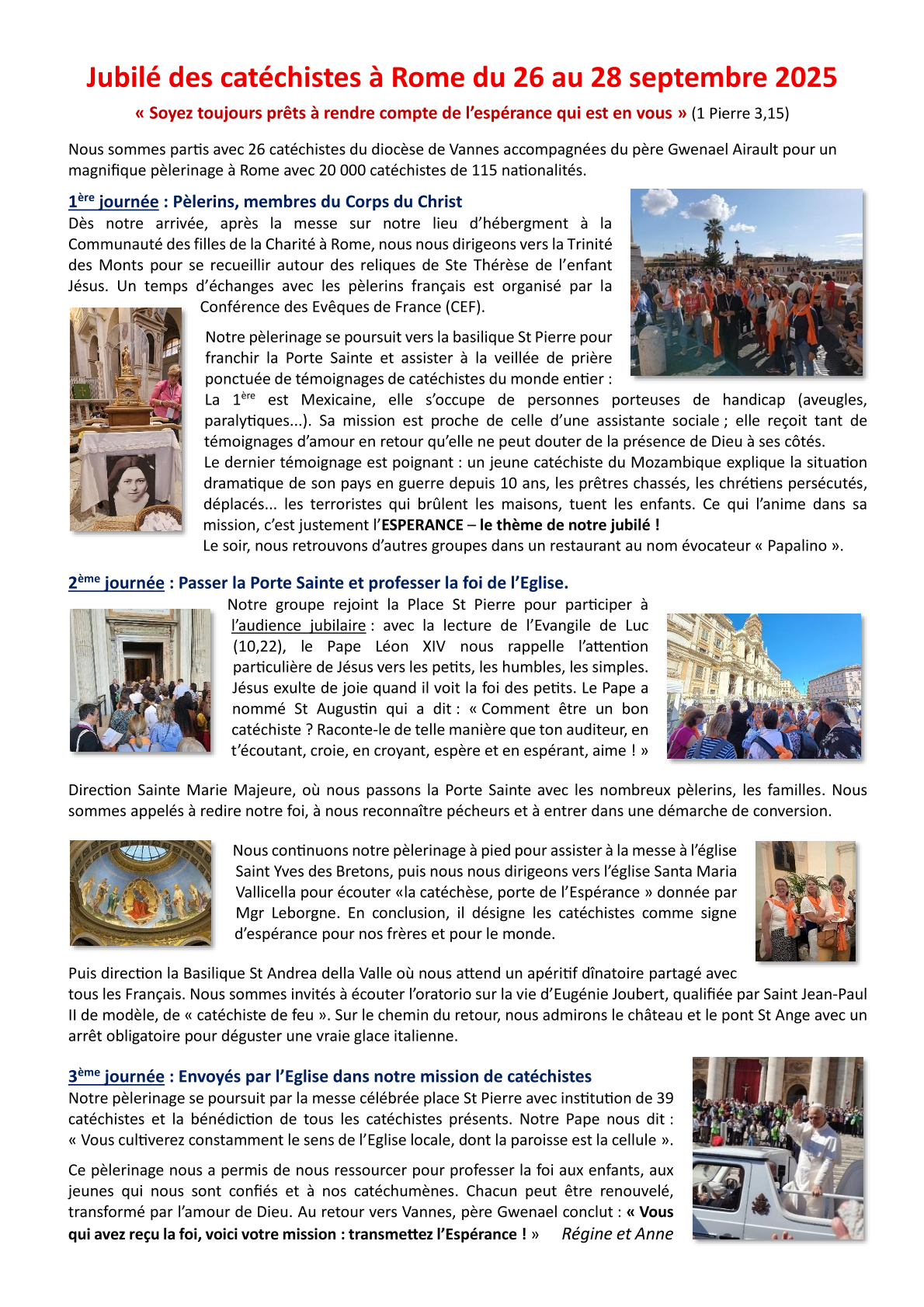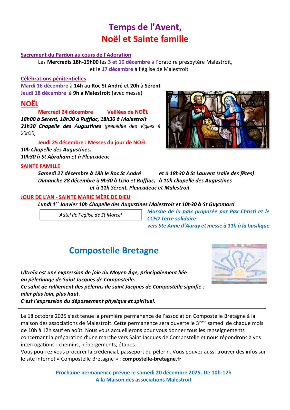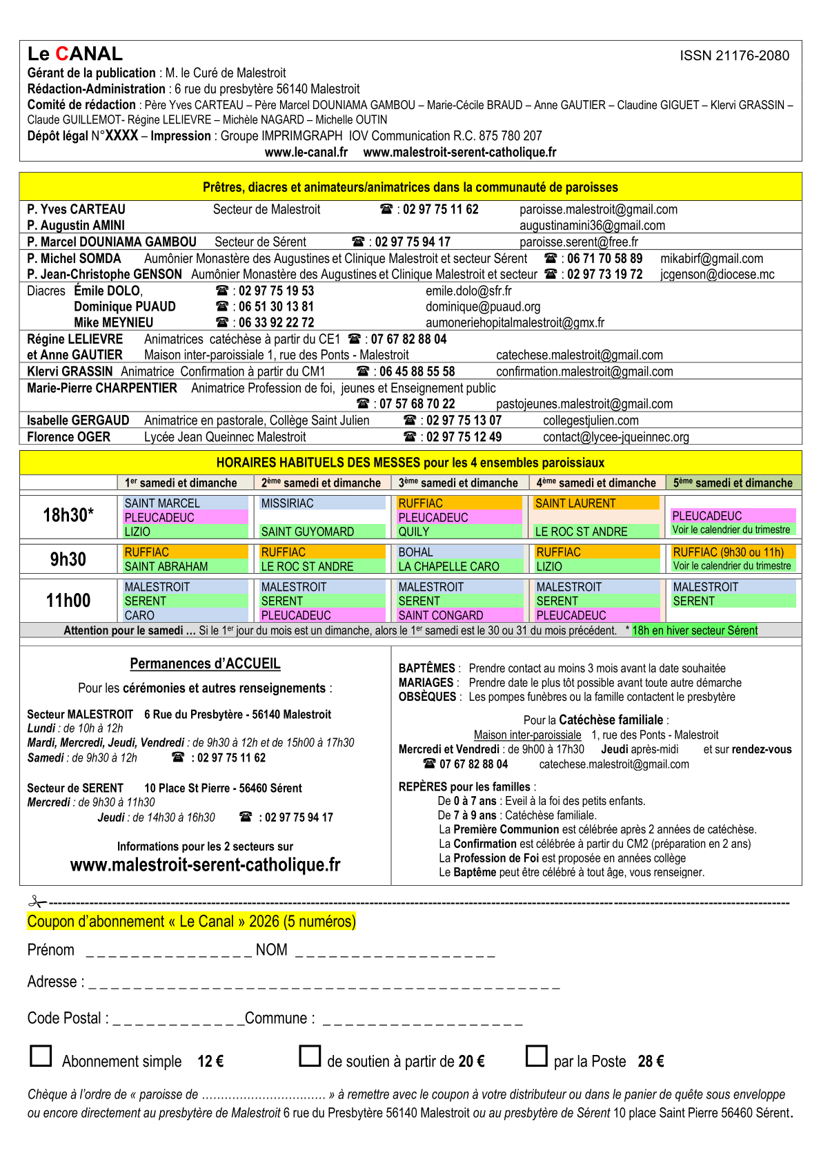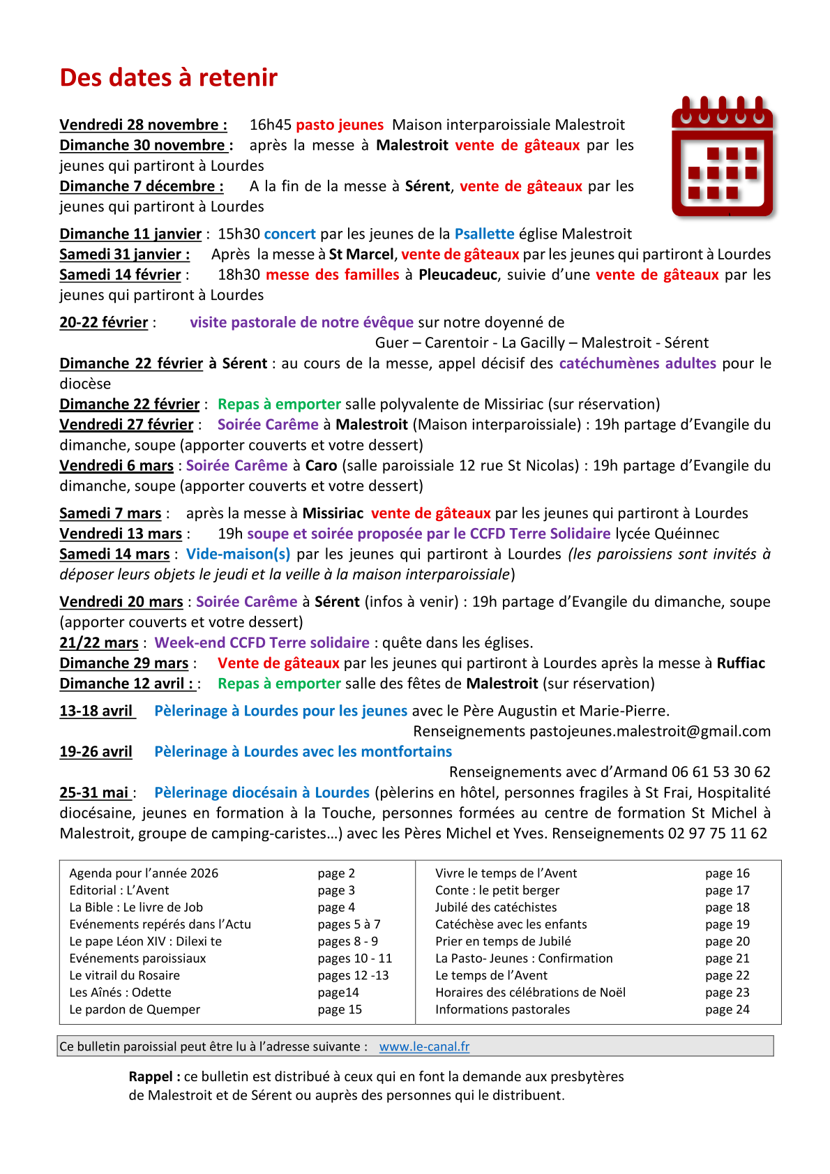 page 2, Agenda 2026 page 3, Editorial: l'Avent page 4, La Bible: Le livre de Job page 5, Repéré dans l'Actu page 6, Repéré dans l'Actu page 7, Repéré dans l'Actu page 8, Le Pape Léon XIV page 9, Dilexi te page 10, Evénements paroissiaux page 11, Evénements paroissiaux page 12, Le Vitrail du Rosaire page 13, Le Vitrail du Rosaire page 14, Le Aînés : Odette page 15, Le Pardon de Quemper page 16, Vivre le temps de l'Avent page 17, Conte : le petit berger page 18, Jubilé des catéchistes page 19, Catéchèse des enfants page 20, Prier en temps de Jubilé page 21, Pasto Jeunes : la Confirmation page 22, Le temps de l'Avent page 23, Les horaires de Noël page 24, Informations pastorales