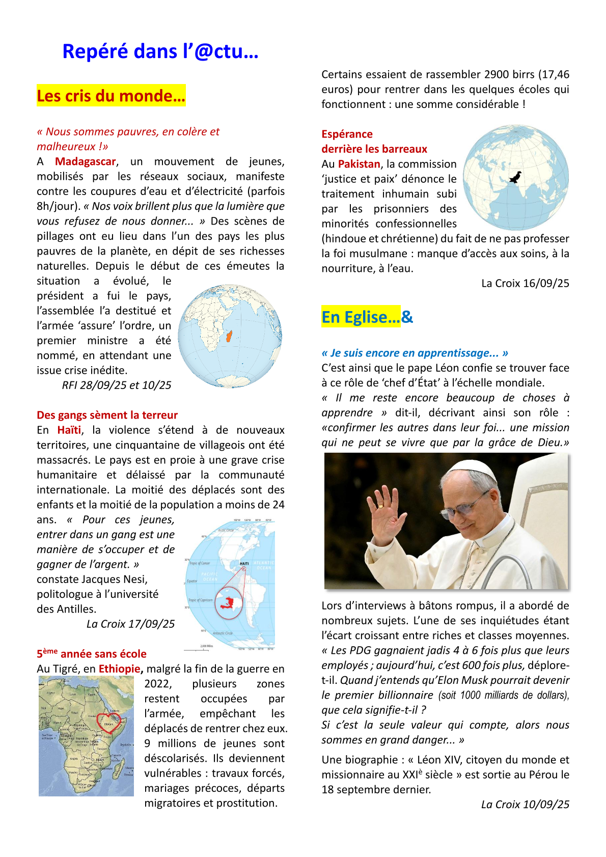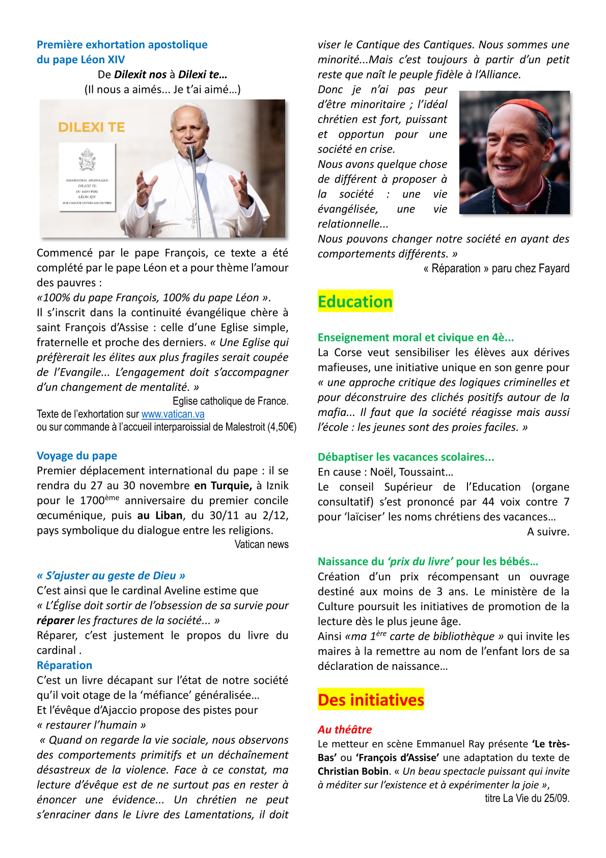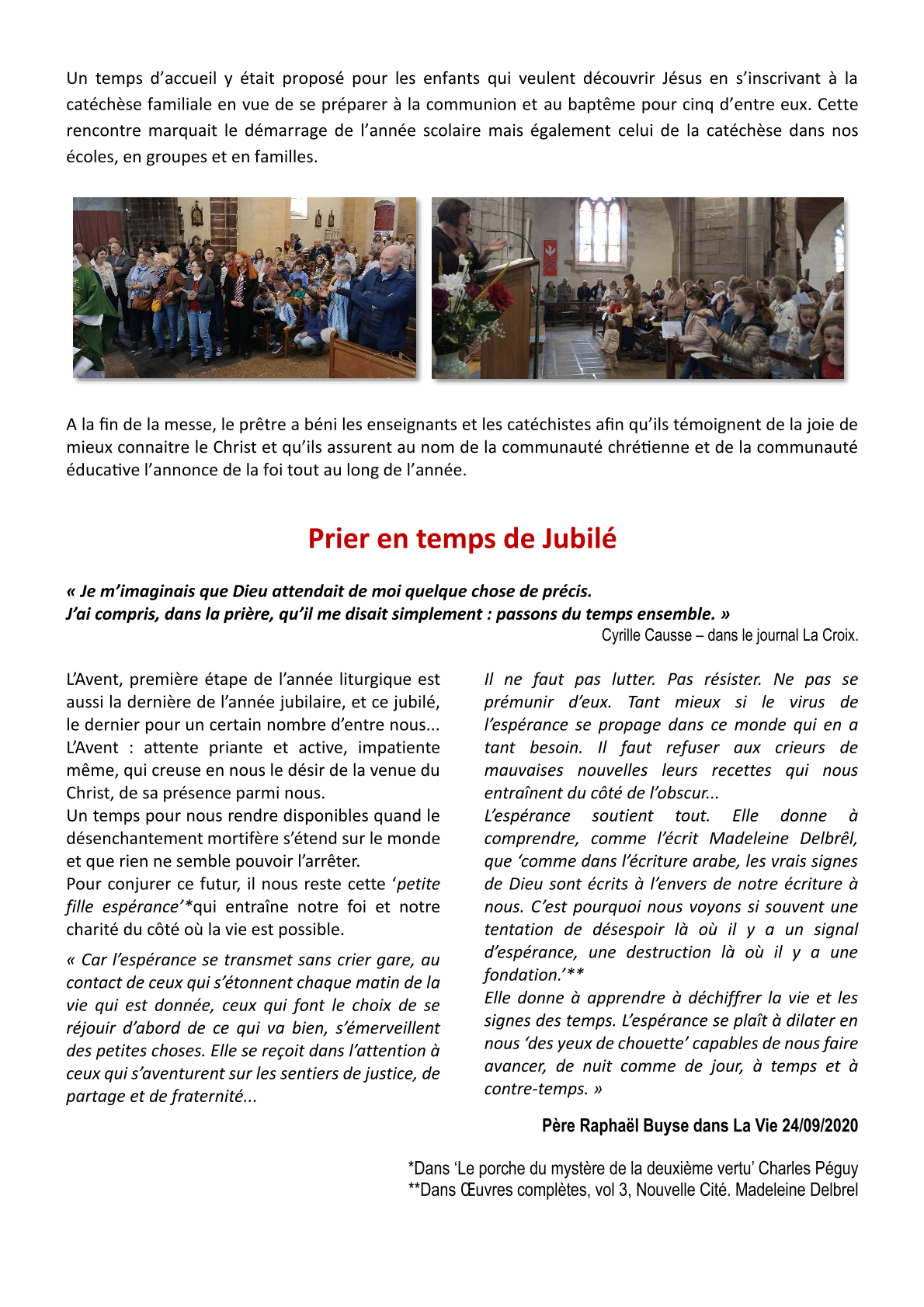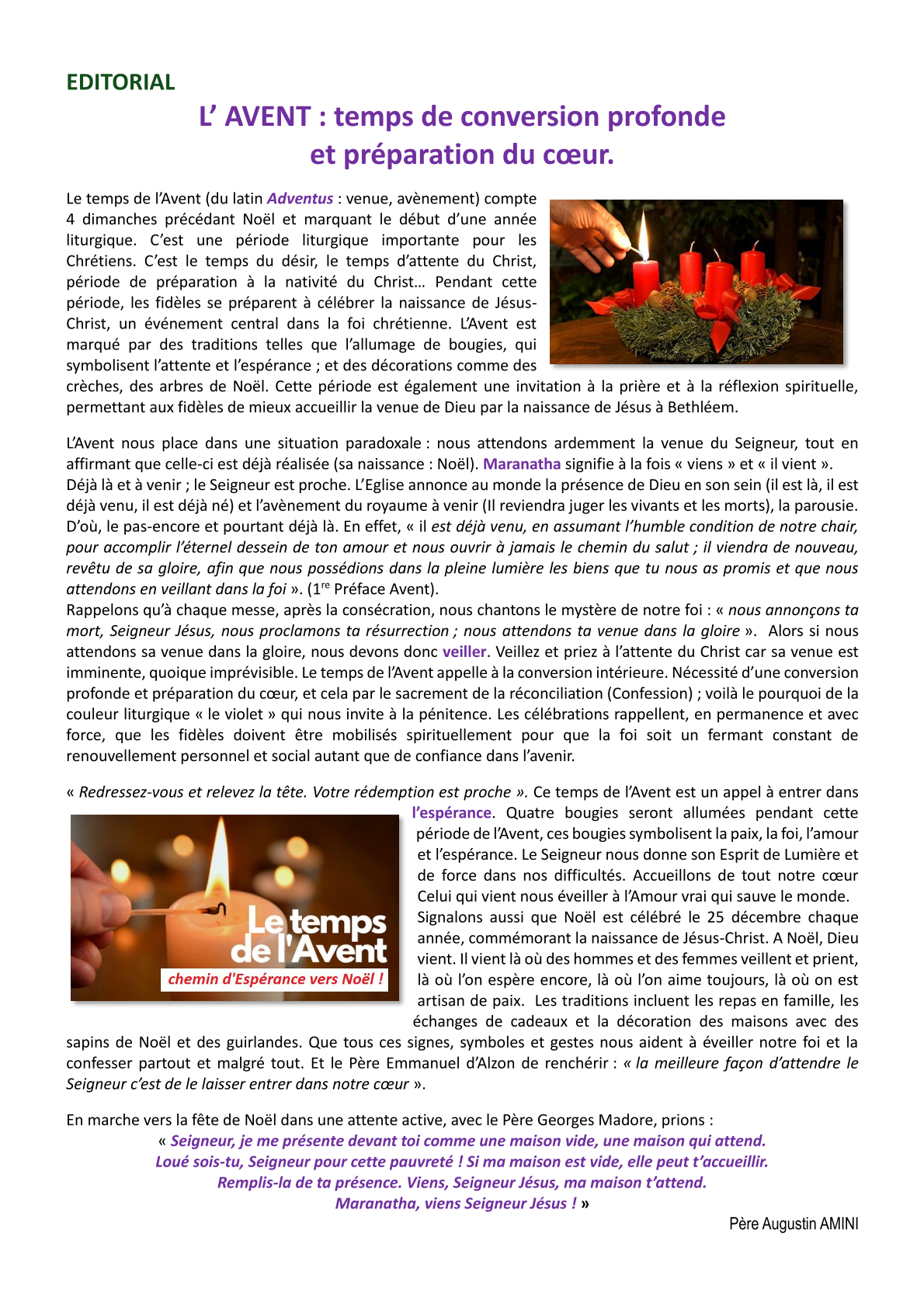 page 2, Agenda 2026 page 3, Editorial: l'Avent page 4, La Bible: Le livre de Job page 5, Repéré dans l'Actu page 6, Repéré dans l'Actu page 7, Repéré dans l'Actu page 8, Le Pape Léon XIV page 9, Dilexi te page 10, Evénements paroissiaux page 11, Evénements paroissiaux page 12, Le Vitrail du Rosaire page 13, Le Vitrail du Rosaire page 14, Le Aînés : Odette page 15, Le Pardon de Quemper page 16, Vivre le temps de l'Avent page 17, Conte : le petit berger page 18, Jubilé des catéchistes page 19, Catéchèse des enfants page 20, Prier en temps de Jubilé page 21, Pasto Jeunes : la Confirmation page 22, Le temps de l'Avent page 23, Les horaires de Noël page 24, Informations pastorales